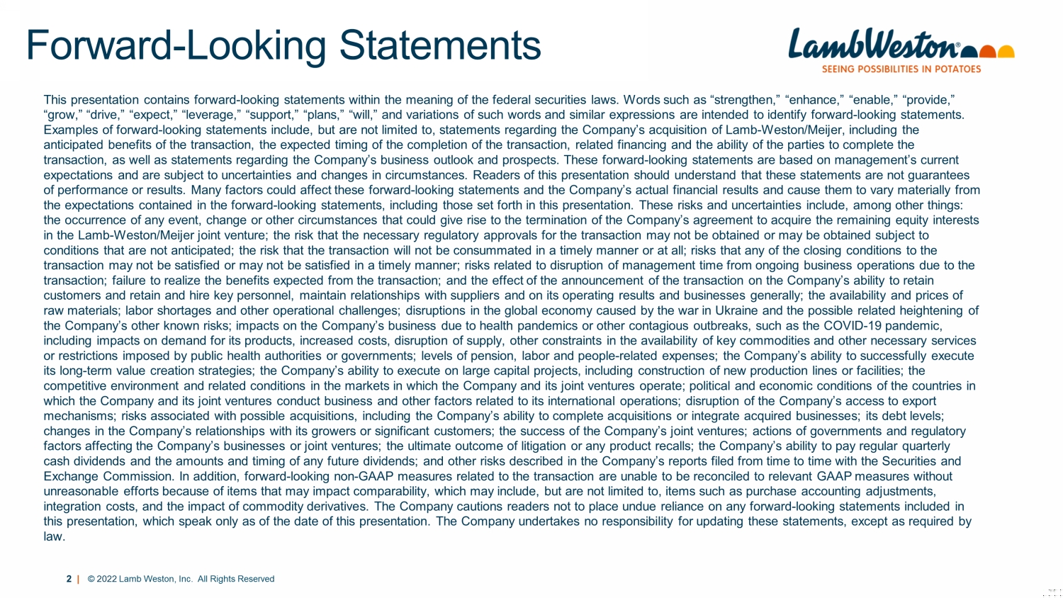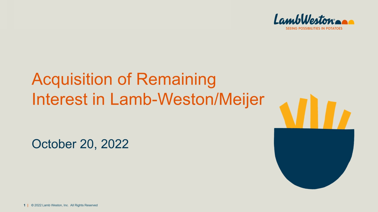 1 | © 2022 Lamb Weston, Inc. All Rights Reserved Acquisition of Remaining Interest in Lamb - Weston/Meijer October 20, 2022