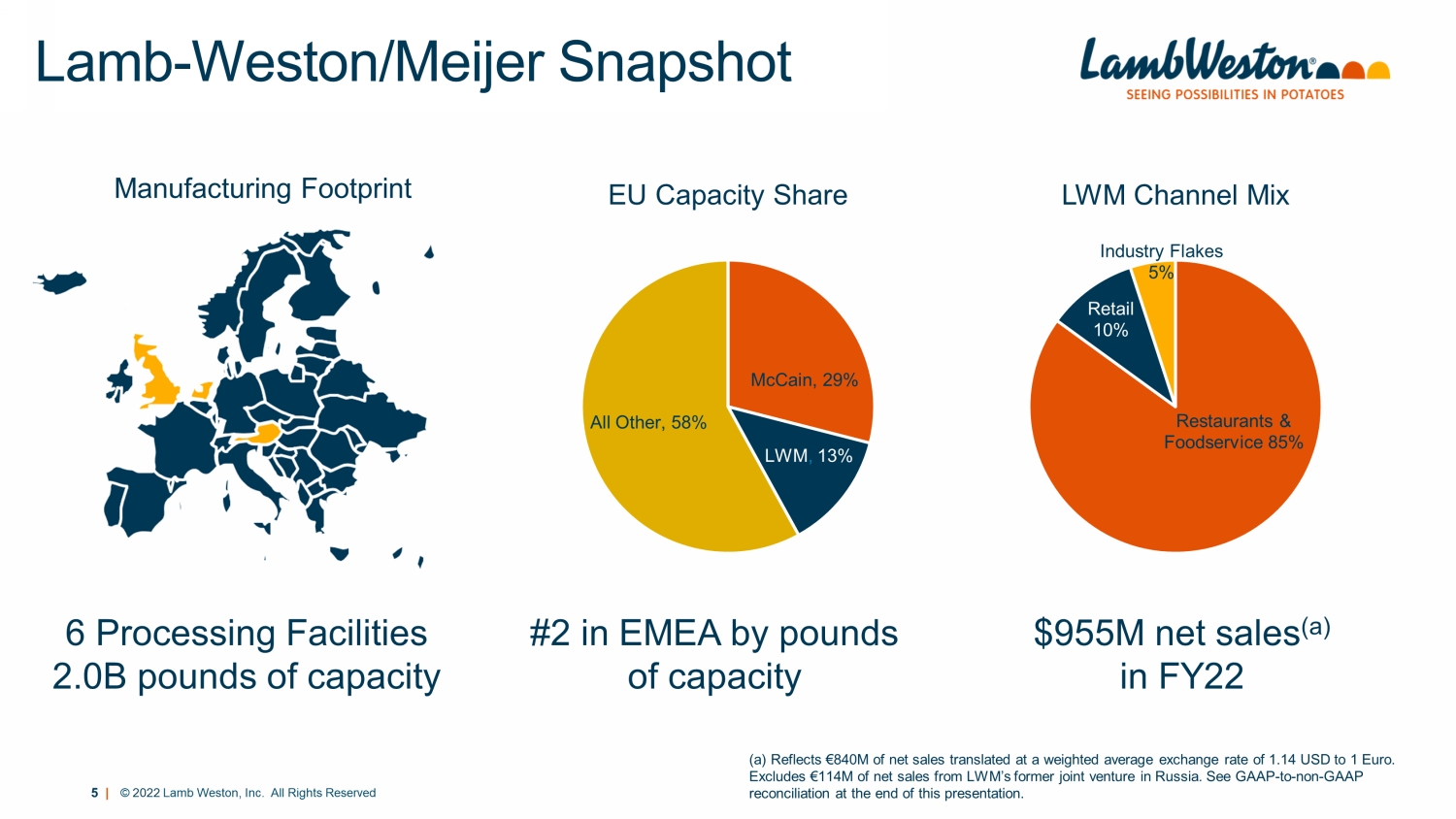 4 | © 2022 Lamb Weston, Inc. All Rights Reserved Lamb - Weston/Meijer Strategic Benefits Strengthens Global Manufacturing Footprint Ability to fully leverage low - cost structure in Europe Aligned culture supports collaboration and best - in - class manufacturing practices Enhances Customer Centric Operating Model Single commercial voice to global customers Seamlessly support multi - national customers with a truly global supply chain Enables Continued Growth in the Attractive European Market Expanded customer base in Europe, Middle East and Africa (EMEA) region Centralized European market provides accessibility to service the world Provide Full Control of Global Growth Opportunities and Operating Strategies Improved platform for further consolidation opportunities in Europe Opportunity to integrate systems and processes to drive cost savings