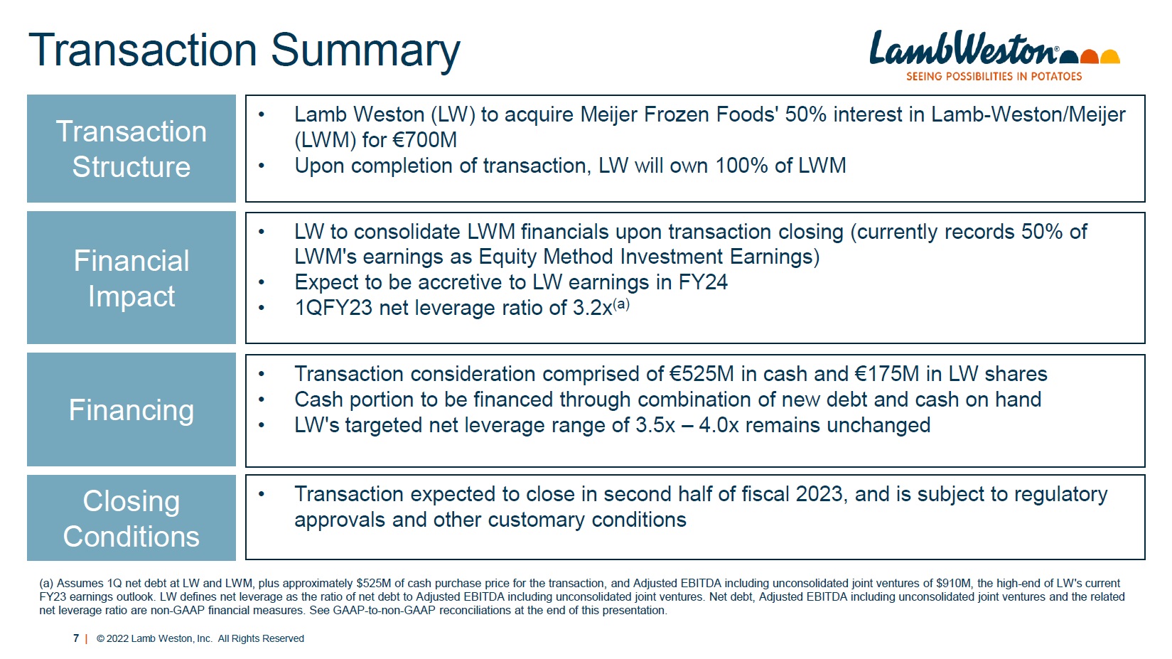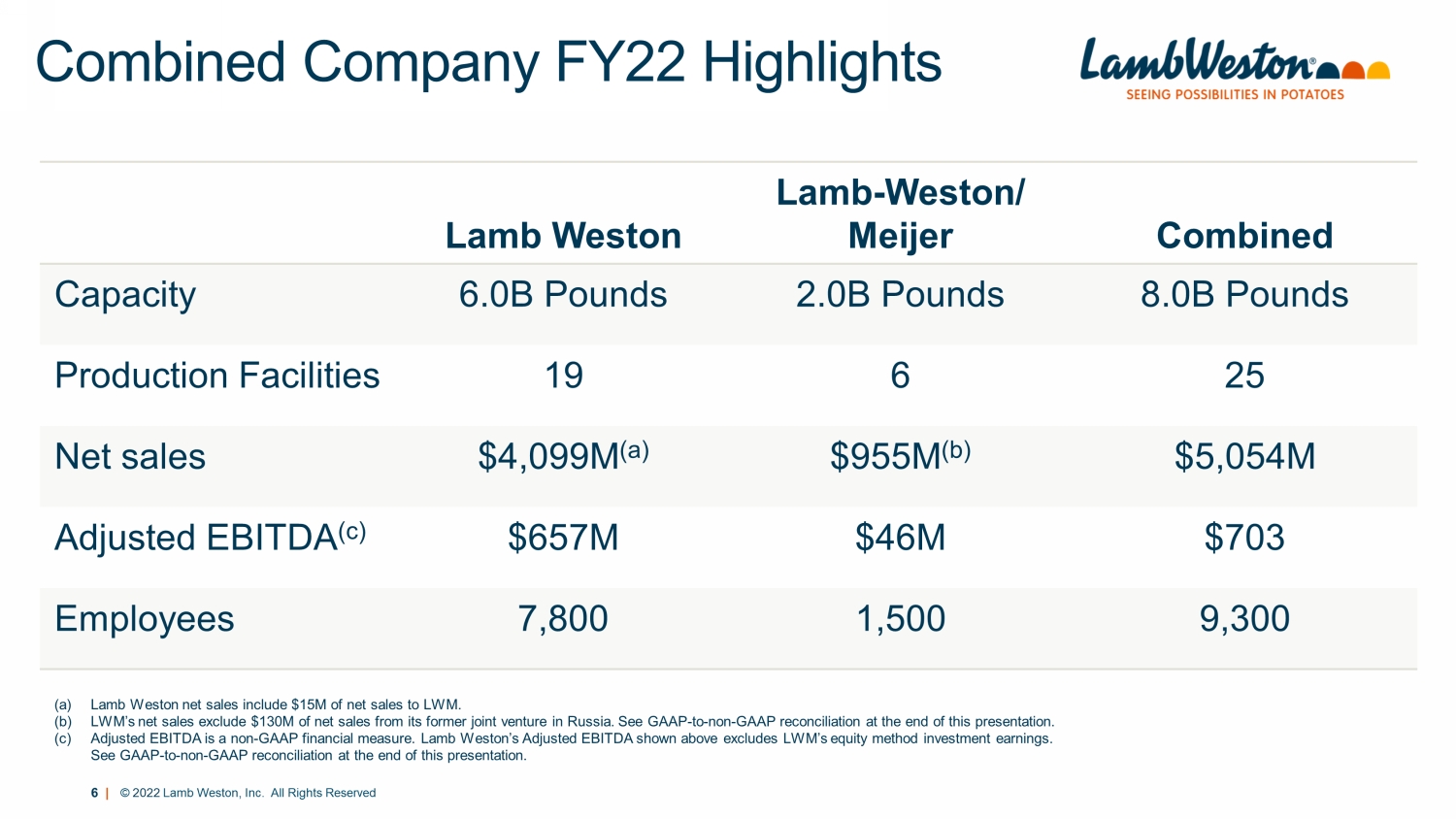 6 | © 2022 Lamb Weston, Inc. All Rights Reserved Combined Company FY22 Highlights Lamb Weston Lamb - Weston/ Meijer Combined Capacity 6.0B Pounds 2.0B Pounds 8.0B Pounds Production Facilities 19 6 25 Net sales $4,099M (a) $955M (b) $5,054M Adjusted EBITDA (c) $657M $46M $703 Employees 7,800 1,500 9,300 (a) Lamb Weston net sales include $15M of net sales to LWM. (b) LWM’s net sales exclude $130M of net sales from its former joint venture in Russia. See GAAP - to - non - GAAP reconciliation at the end of this presentation. (c) Adjusted EBITDA is a non - GAAP financial measure. Lamb Weston’s Adjusted EBITDA shown above excludes LWM’s equity method investment earnings. See GAAP - to - non - GAAP reconciliation at the end of this presentation.