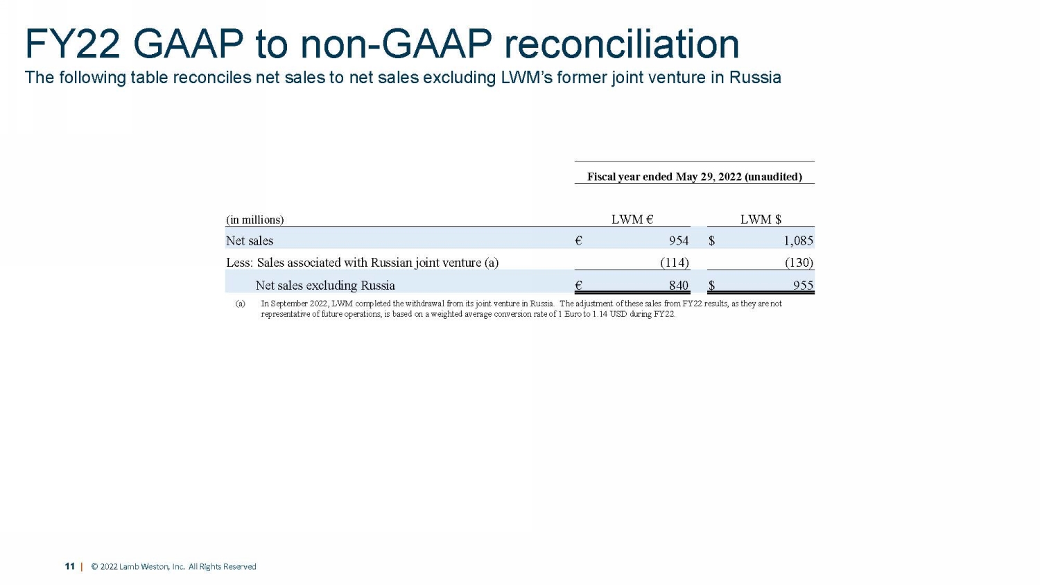 11 | © 2022 Lamb Weston, Inc. All Rights Reserved Fiscal year ended May 29, 2022 (unaudited) (in millions) LWM € LWM $ Net sales € 954 $ 1,085 Less: Sales associated with Russian joint venture (a) (114) (130) Net sales excluding Russia € 840 $ 955 The following table reconciles net sales to net sales excluding LWM’s former joint venture in Russia FY22 GAAP to non - GAAP reconciliation