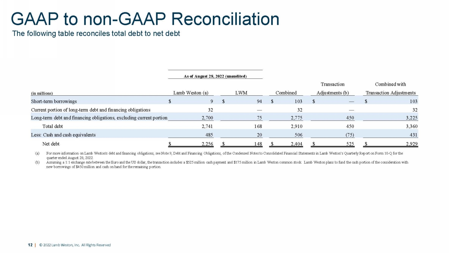 12 | © 2022 Lamb Weston, Inc. All Rights Reserved The following table reconciles total debt to net debt GAAP to non - GAAP Reconciliation As of August 28, 2022 (unaudited) Transaction Combined with (in millions) Lamb Weston (a) LWM Combined Adjustments (b) Transaction Adjustments Short - term borrowings $ 9 $ 94 $ 103 $ — $ 103 Current portion of long - term debt and financing obligations 32 — 32 — 32 Long - term debt and financing obligations, excluding current portion 2,700 75 2,775 450 3,225 Total debt 2,741 168 2,910 450 3,360 Less: Cash and cash equivalents 485 20 506 (75) 431 Net debt $ 2,256 $ 148 $ 2,404 $ 525 $ 2,929